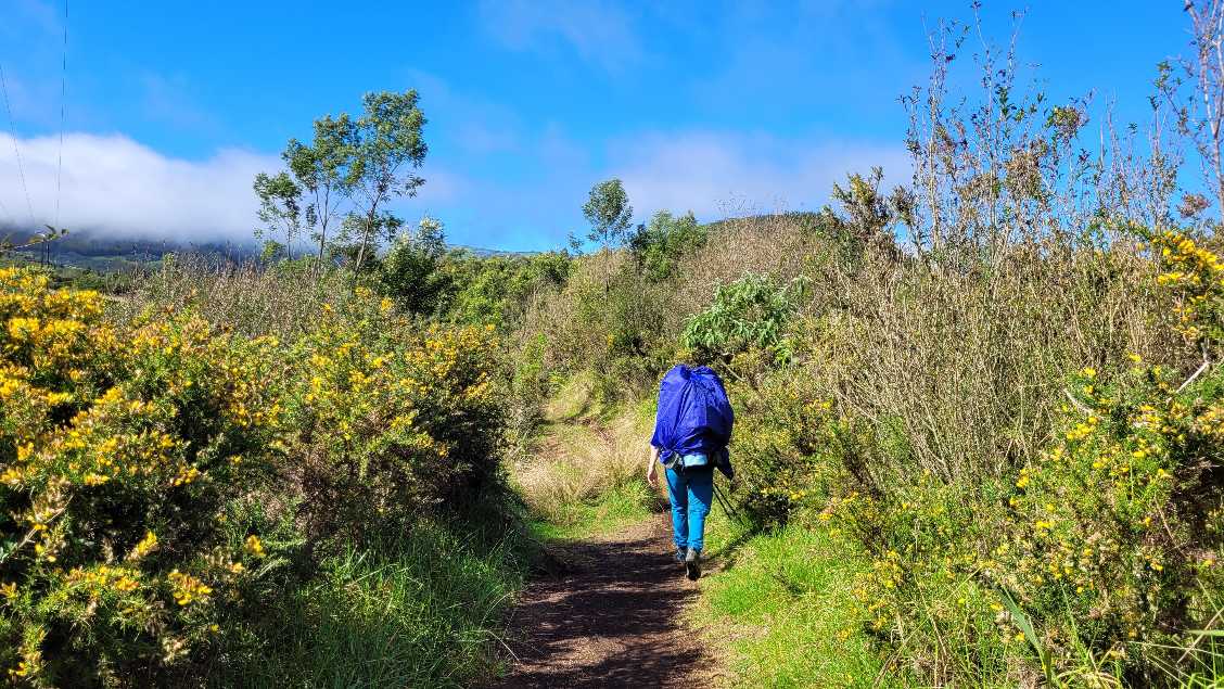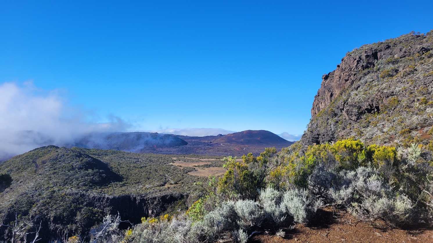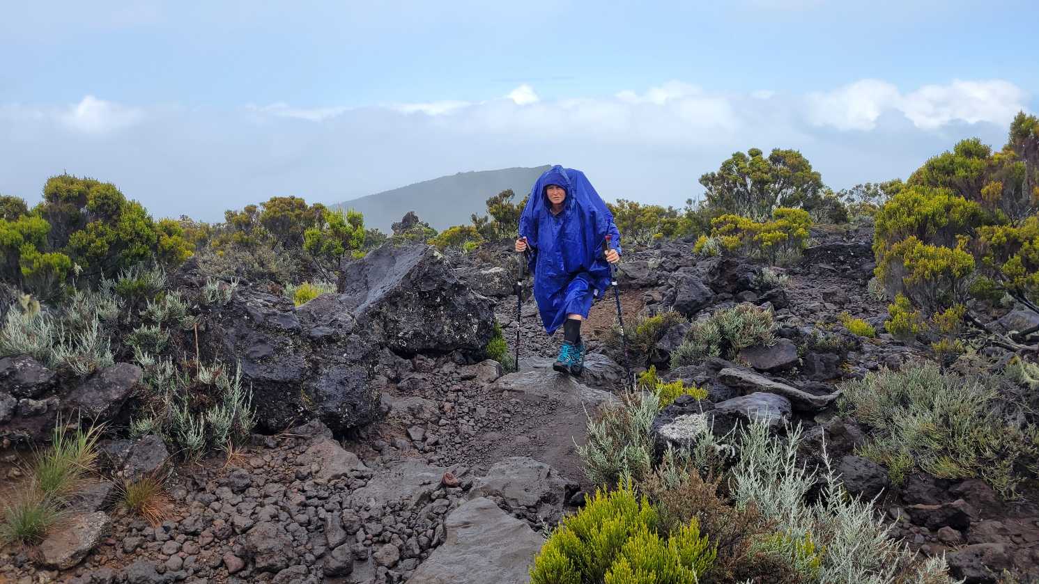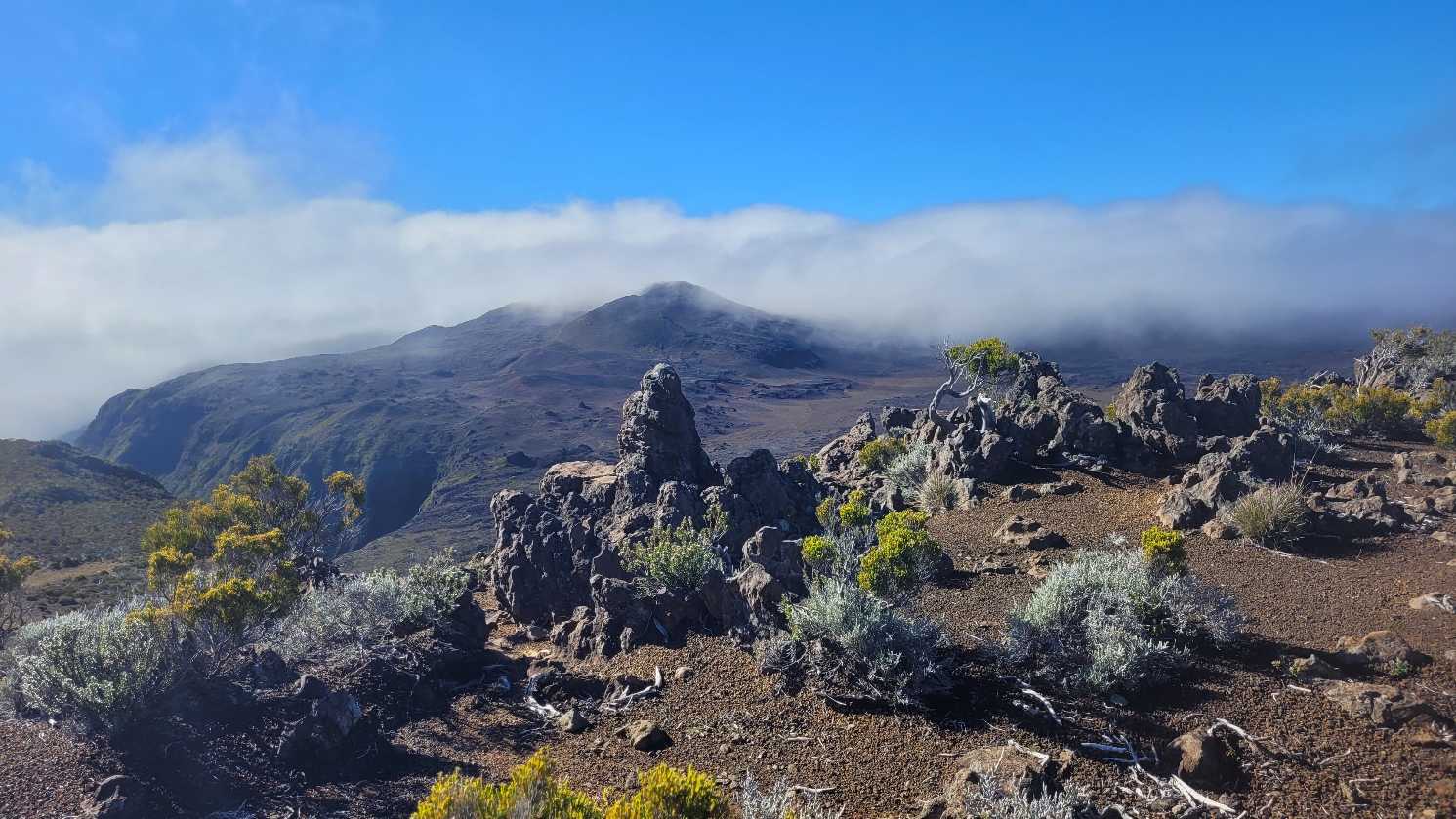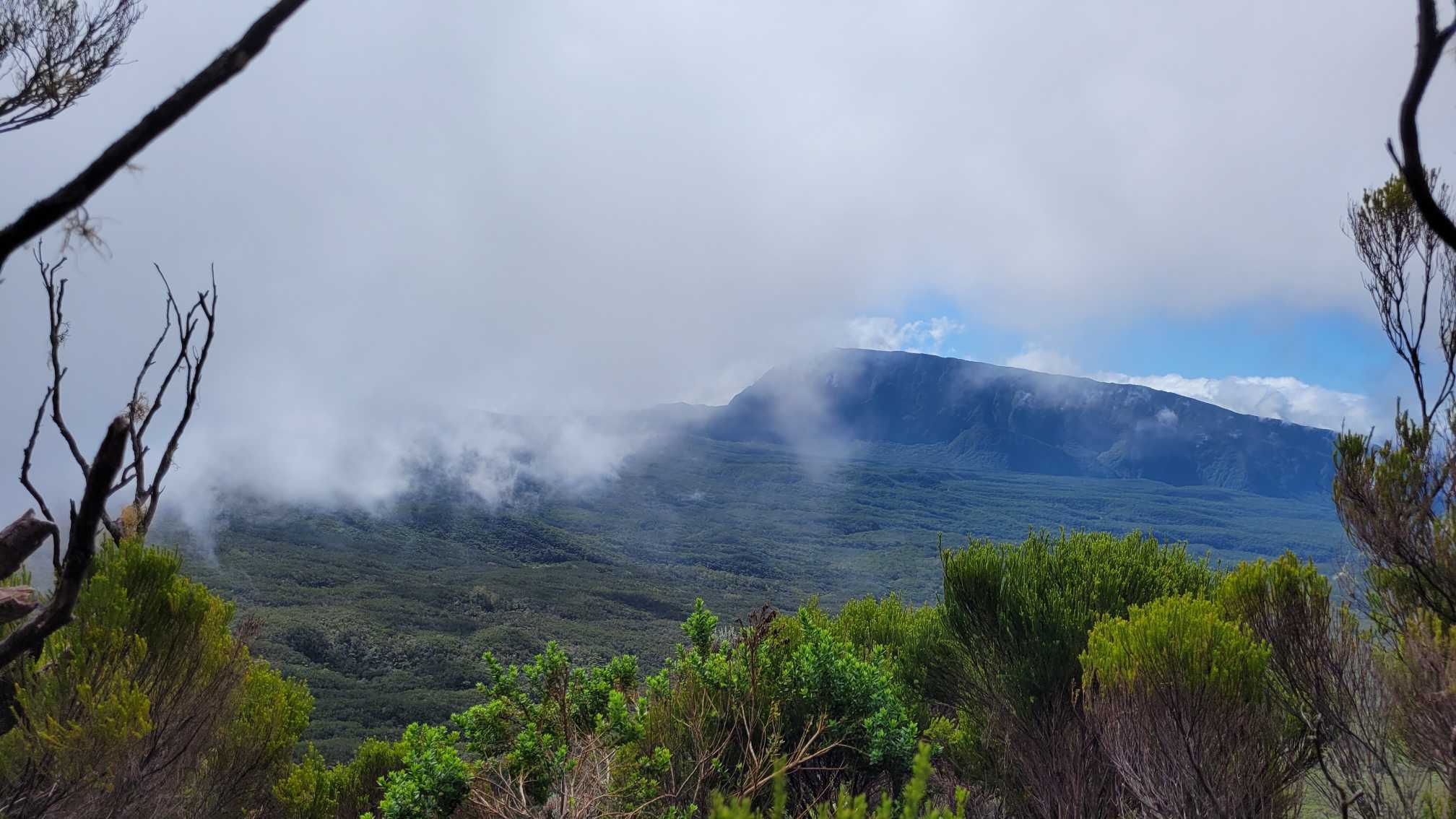Zum Glück ist es aber trocken geblieben. Nach dem Frühstück liefen wir warm angezogen los und erreichten eine Höhe von 2500 m. Leider hatten wir keinen absolut freien Blick auf den Piton de la Fournaise, weil die Wolken ihn meist verdeckten.