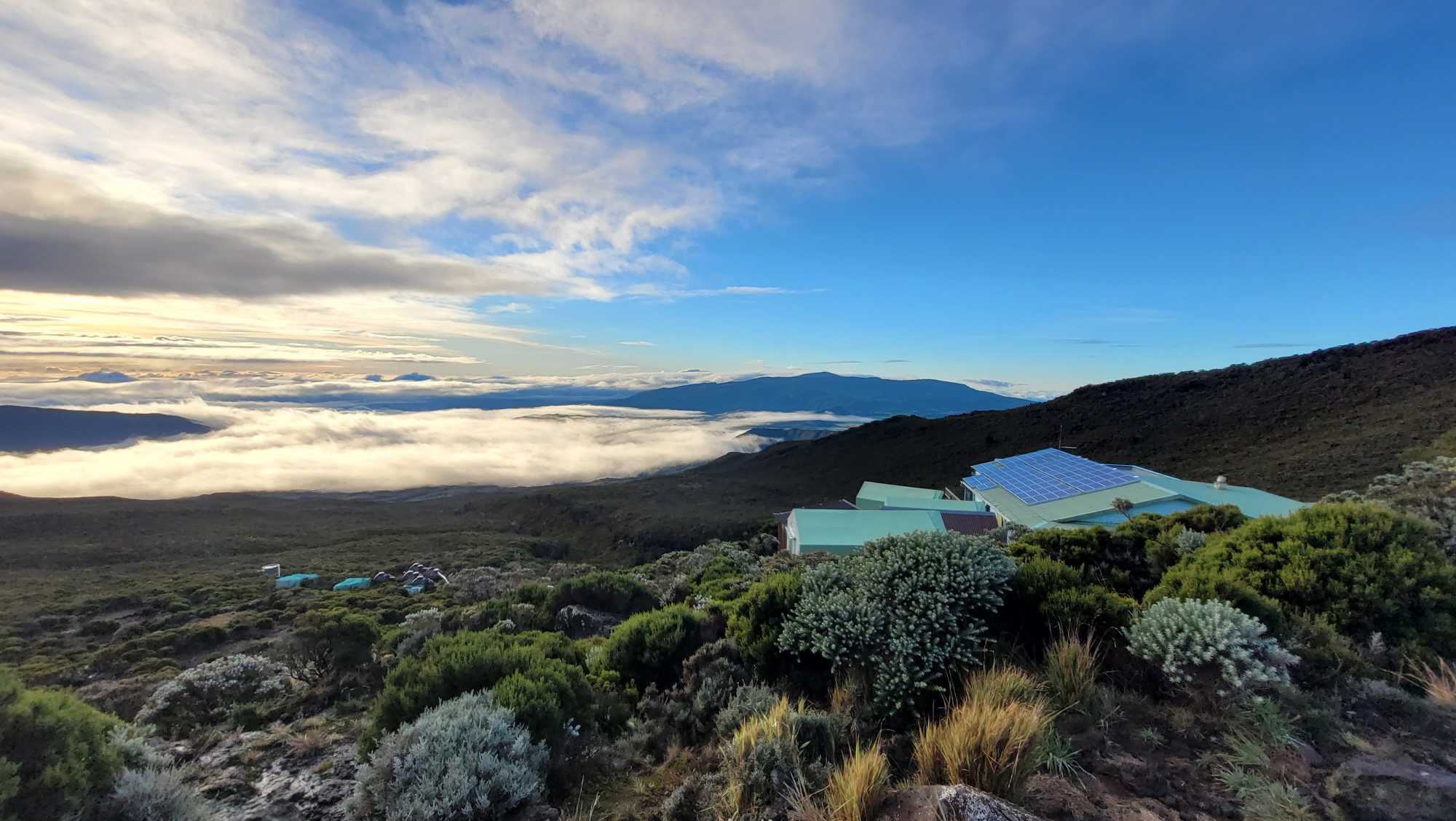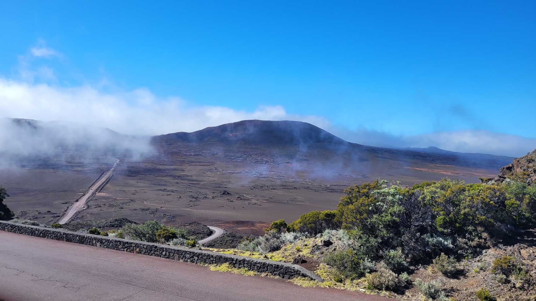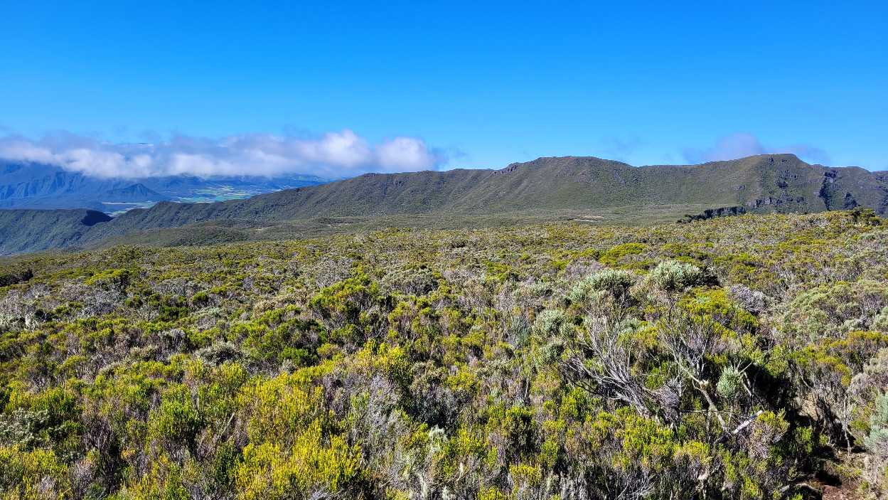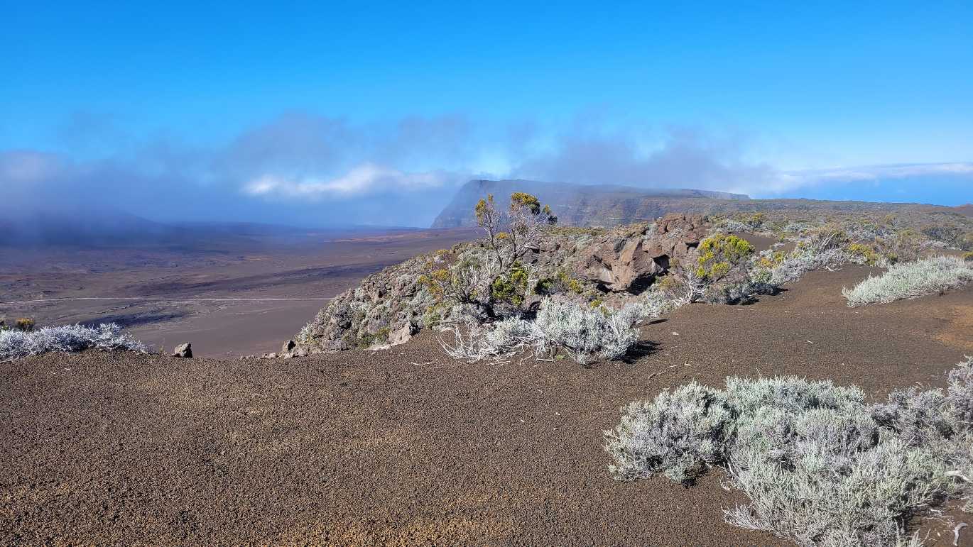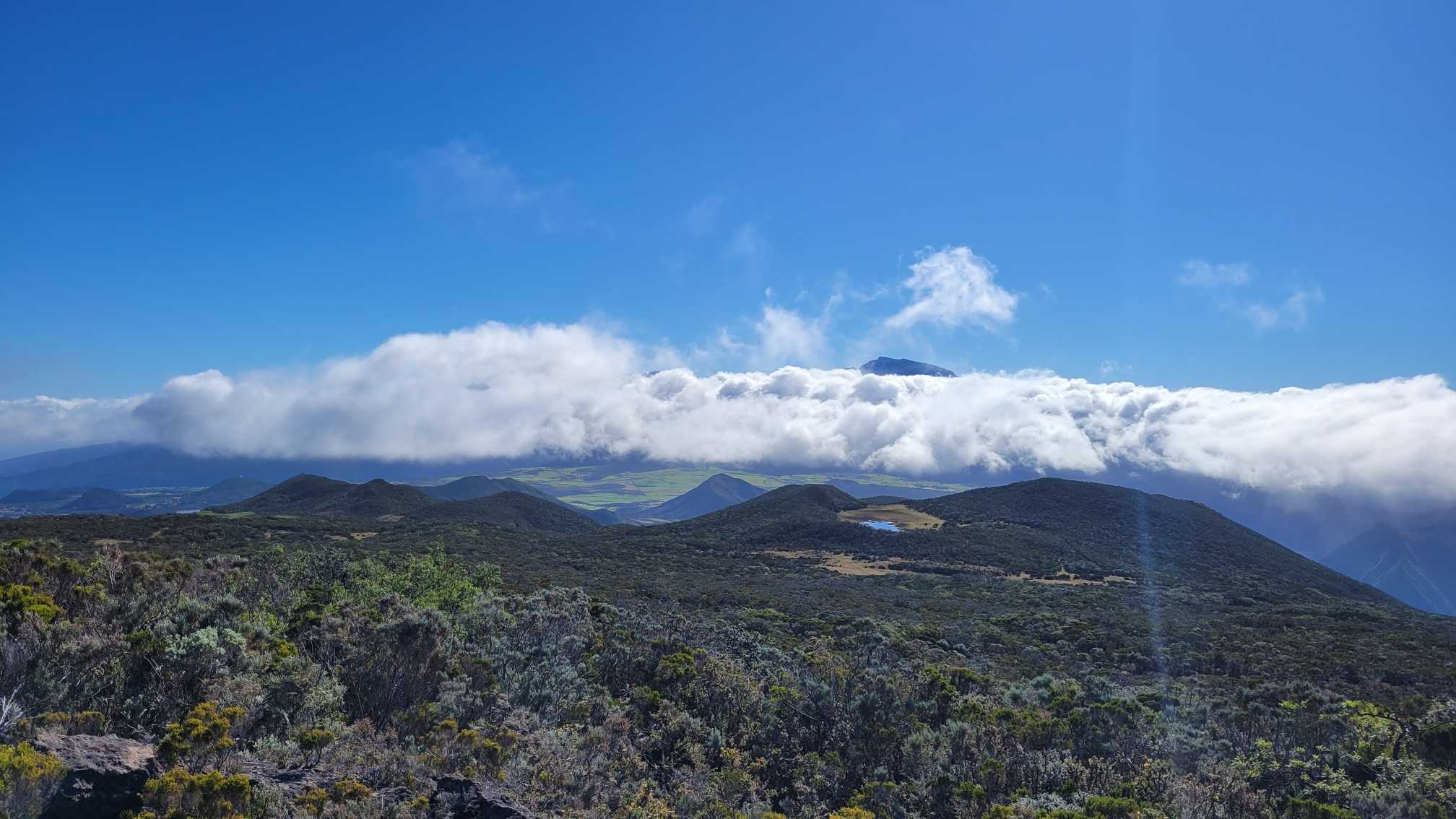 Zum Glück ist es aber trocken geblieben. Nach dem Frühstück liefen wir warm angezogen los und erreichten eine Höhe von 2500 m. Leider hatten wir keinen absolut freien Blick auf den Piton de la Fournaise, weil die Wolken ihn meist verdeckten.