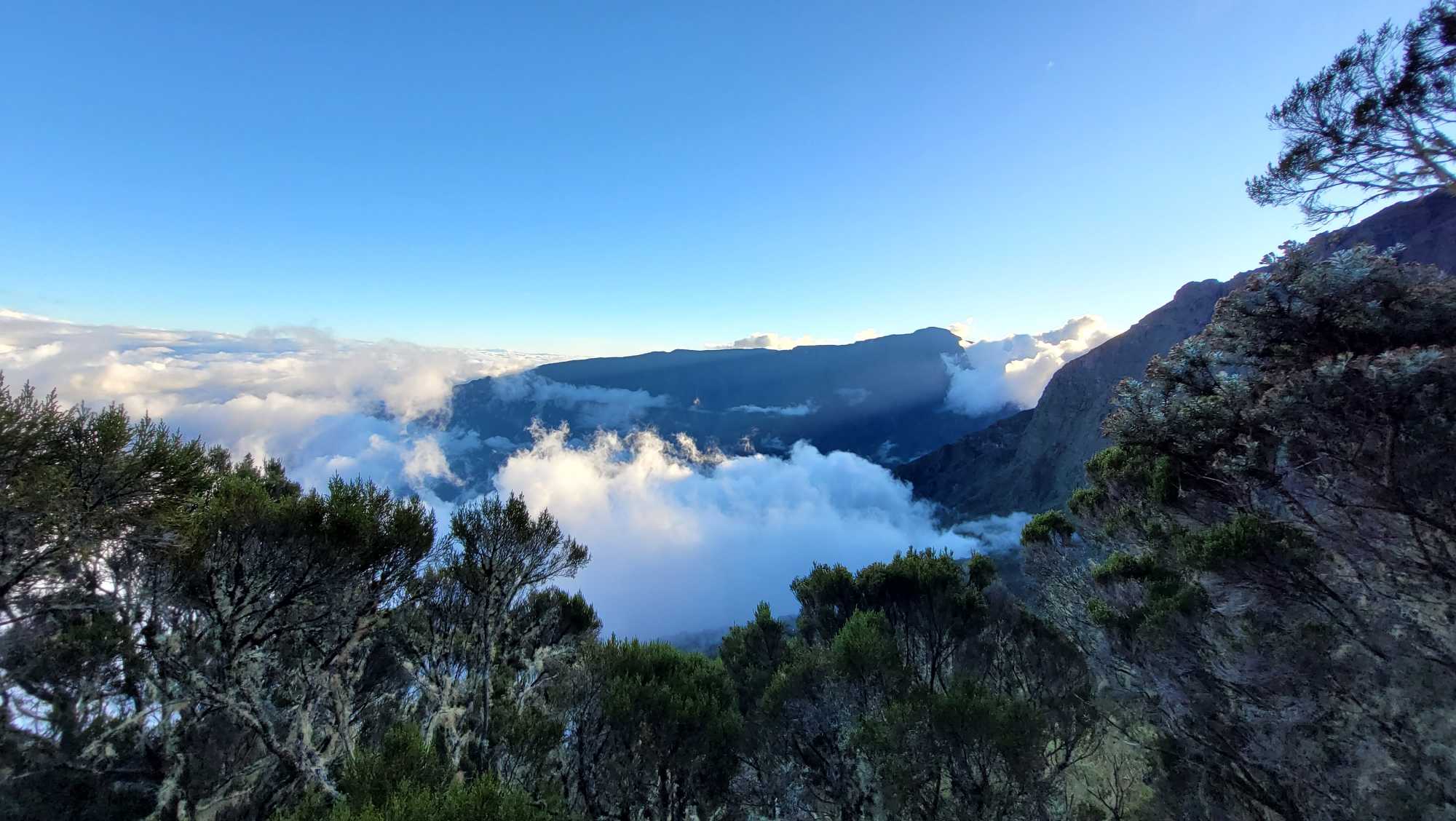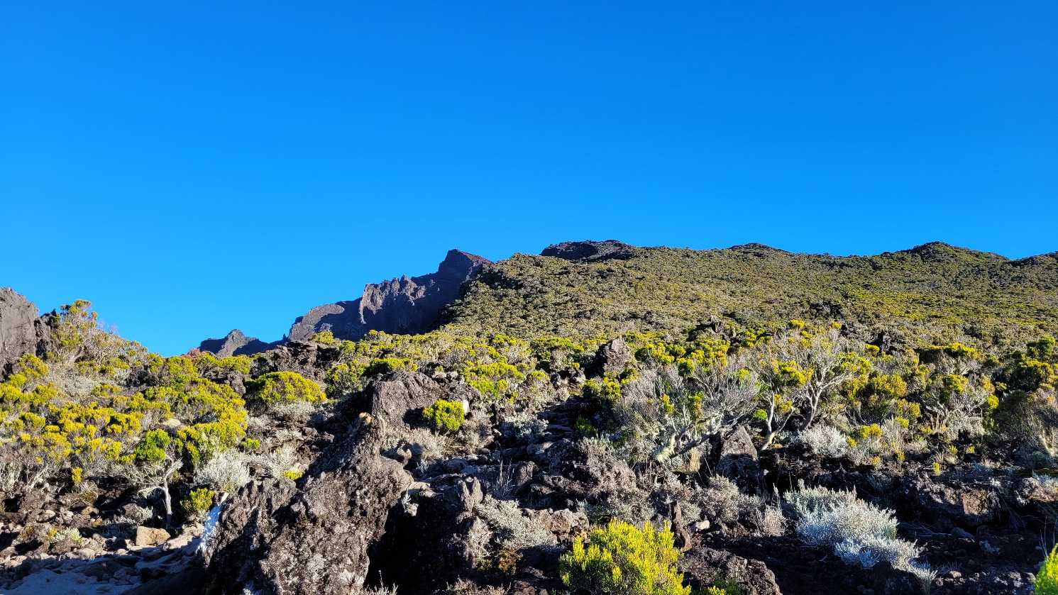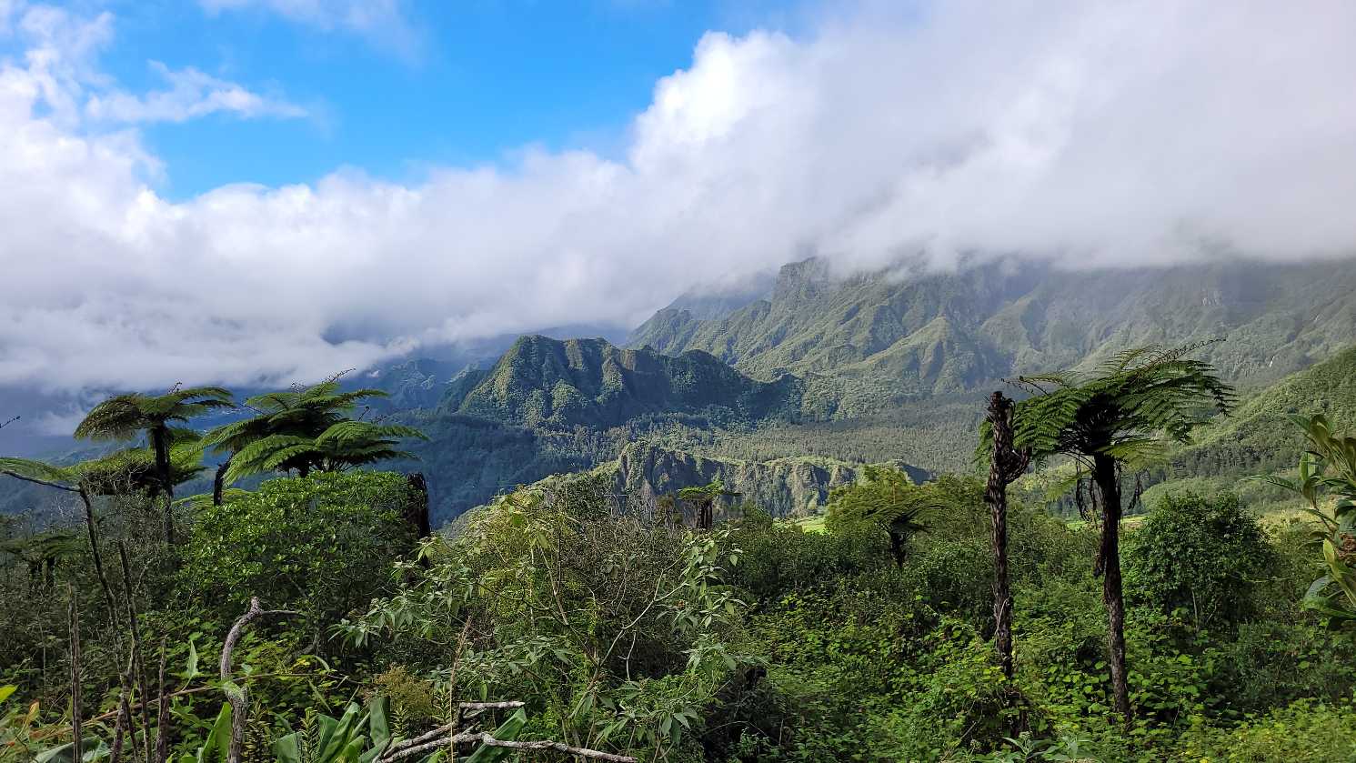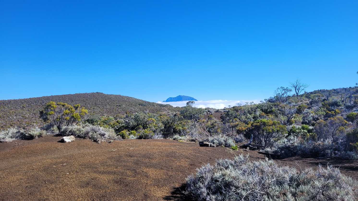Zum Glück ist es aber trocken geblieben. Nach dem Frühstück liefen wir warm angezogen los und erreichten eine Höhe von 2500 m. Leider hatten wir keinen absolut freien Blick auf den Piton de la Fournaise, weil die Wolken ihn meist verdeckten.