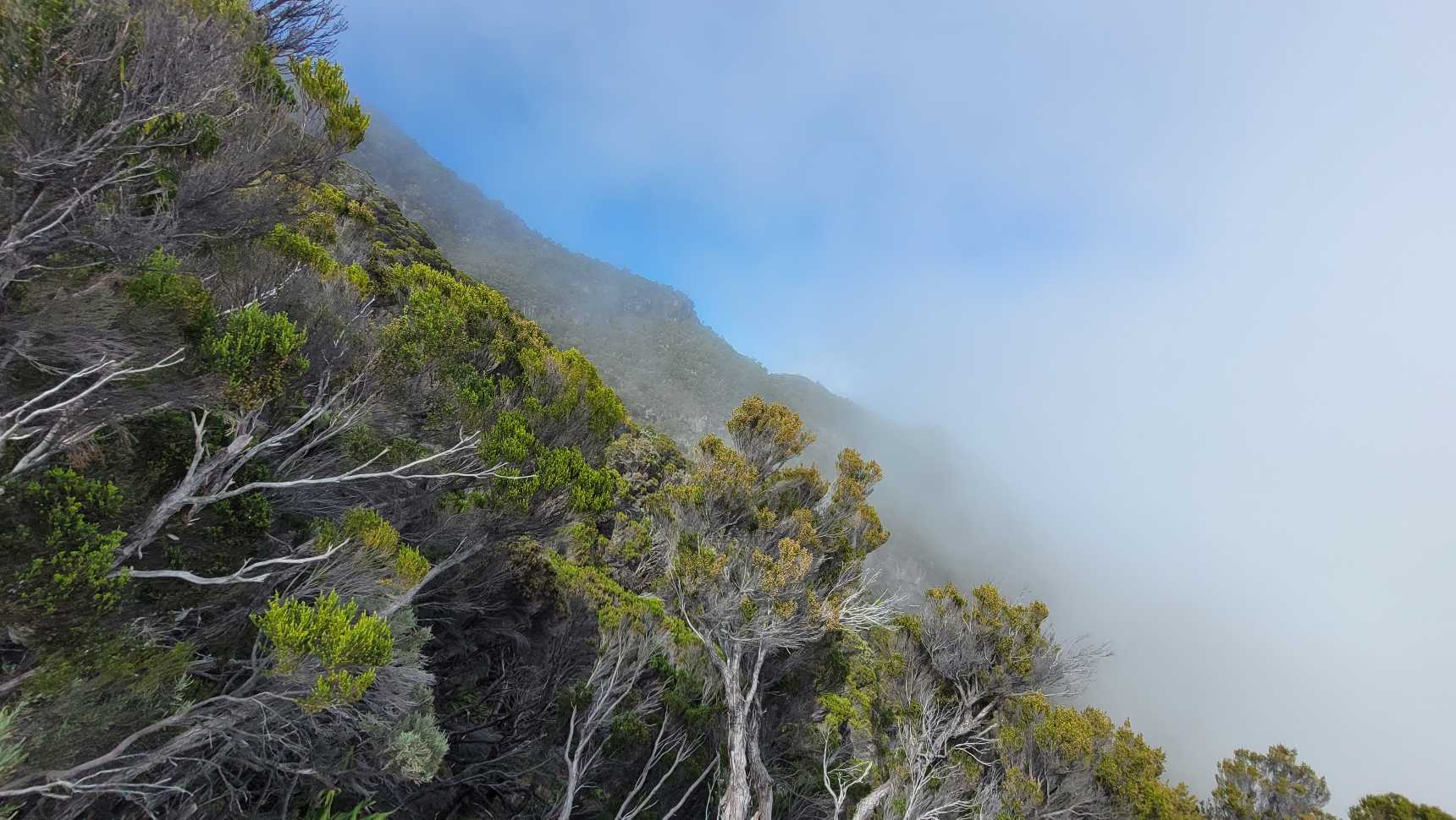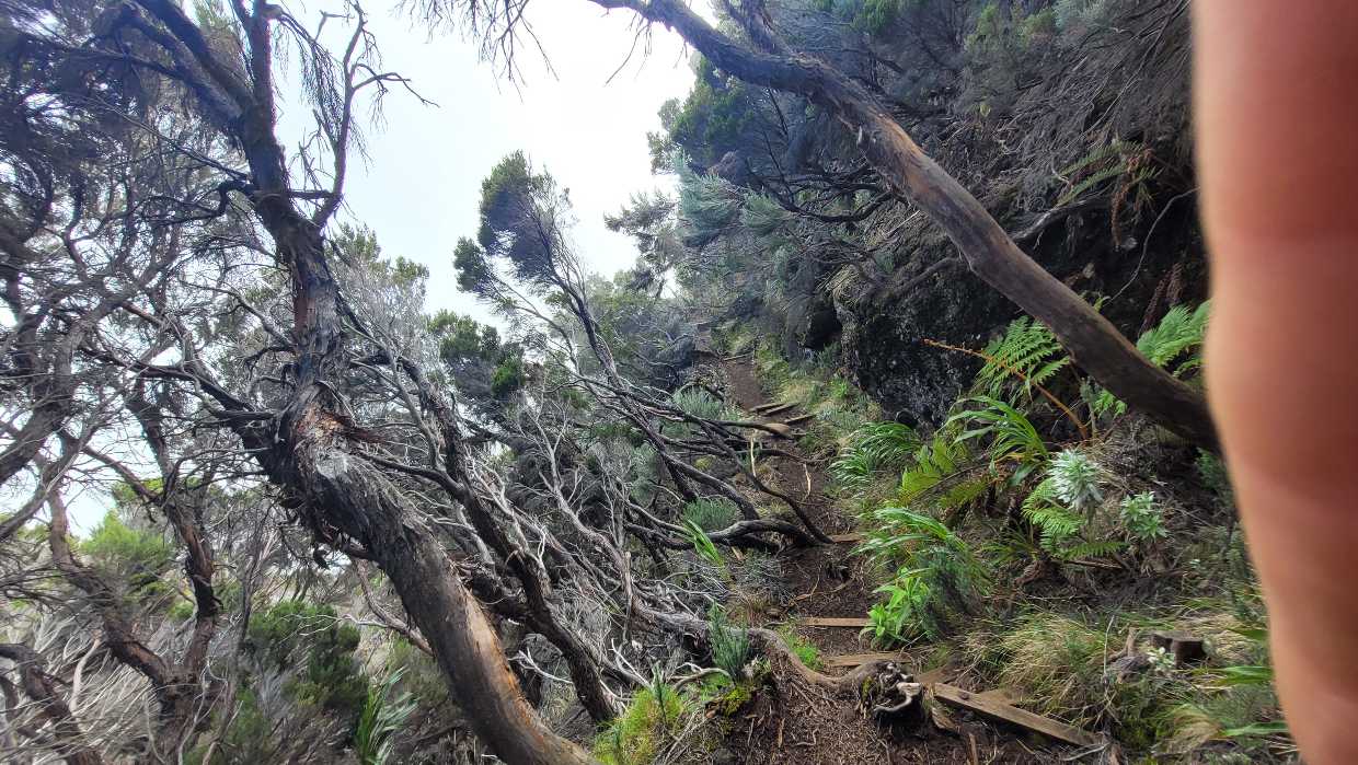 Am Ende der kante änderte sich wieder die Vegetation von Steppe auf Urwald. Nun mussten wir 1400m steil nach unten über einen schmalen steig. Aus dem Steig wurde ein Grad. Leider konnte man nichts viel sehen da starker Nebel aufgezogen ist. Vielleicht war es auch gut, den es schien wirklich steil nach unten zu gehen!