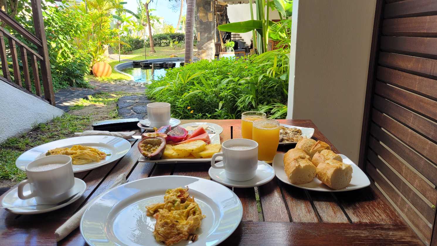 Als wir in Grande Coude ankamen waren wir ziemlich platt von der heutigen langen Strecke und den vielen Höhenmeter. Mit dem Bus fuhren wir dann nochmal ca. 1100m runter auf Meereshöhe in den Ort Saint Joseph. Hier fanden wir eine schöne Unterkunft und erhalten uns bei einem leckeren Wrap und einem Dodo- Bier.