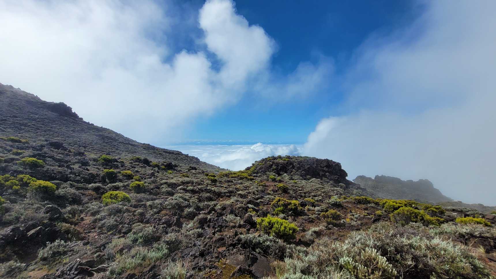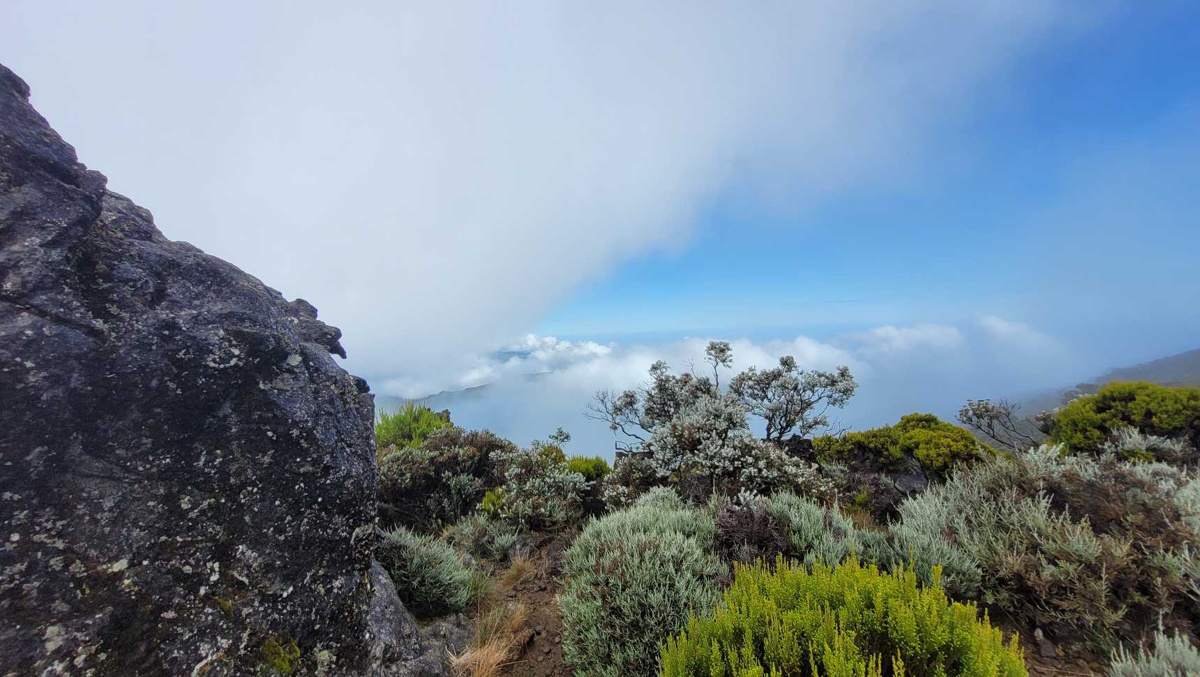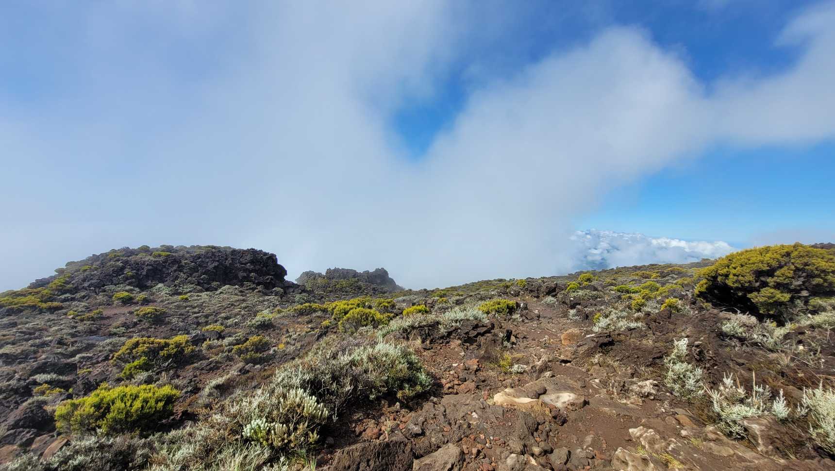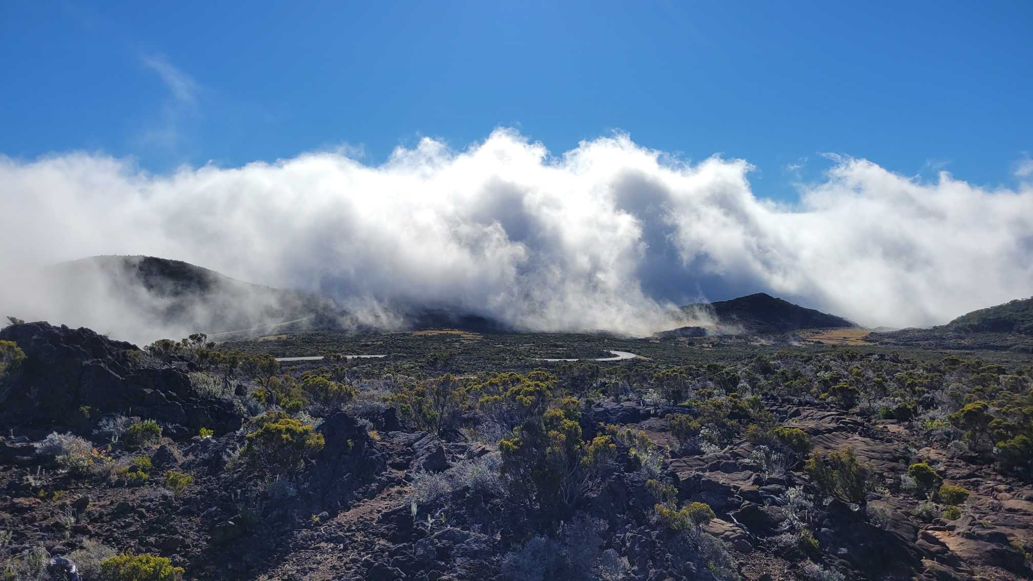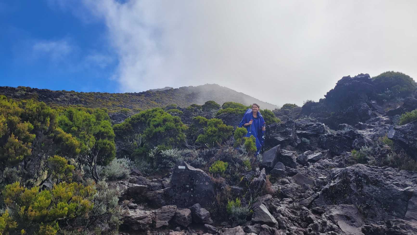 Zum Glück ist es aber trocken geblieben. Nach dem Frühstück liefen wir warm angezogen los und erreichten eine Höhe von 2500 m. Leider hatten wir keinen absolut freien Blick auf den Piton de la Fournaise, weil die Wolken ihn meist verdeckten.