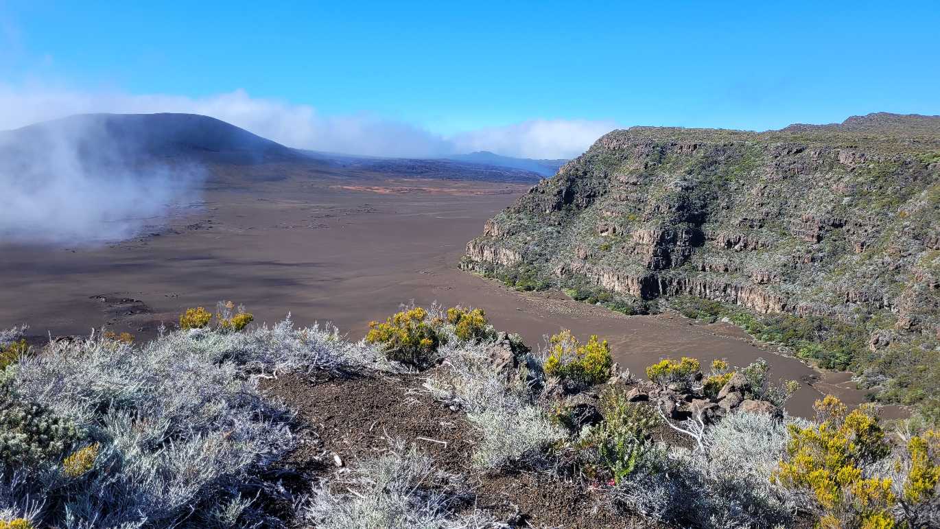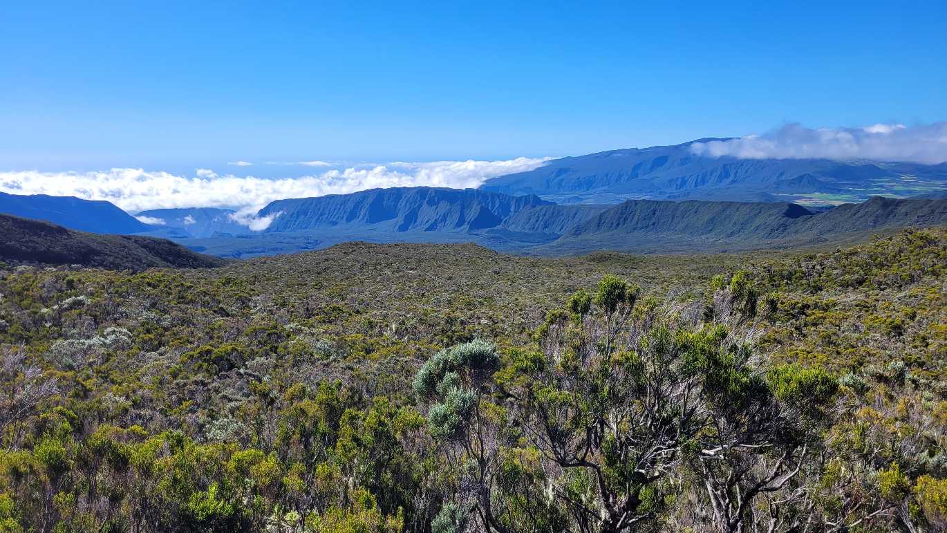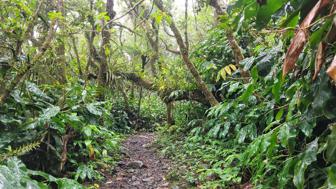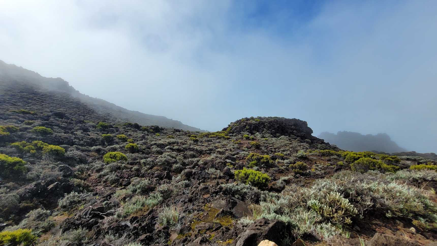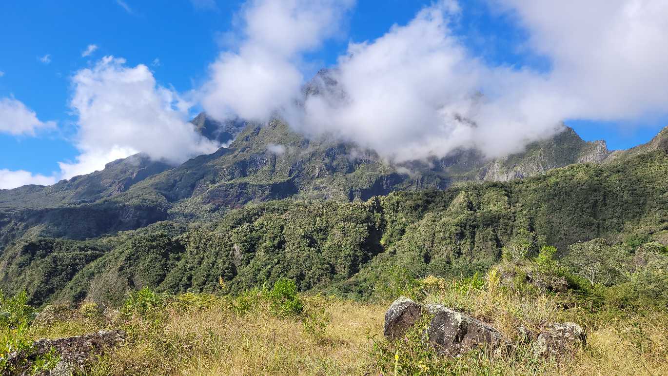 Zum Glück ist es aber trocken geblieben. Nach dem Frühstück liefen wir warm angezogen los und erreichten eine Höhe von 2500 m. Leider hatten wir keinen absolut freien Blick auf den Piton de la Fournaise, weil die Wolken ihn meist verdeckten.