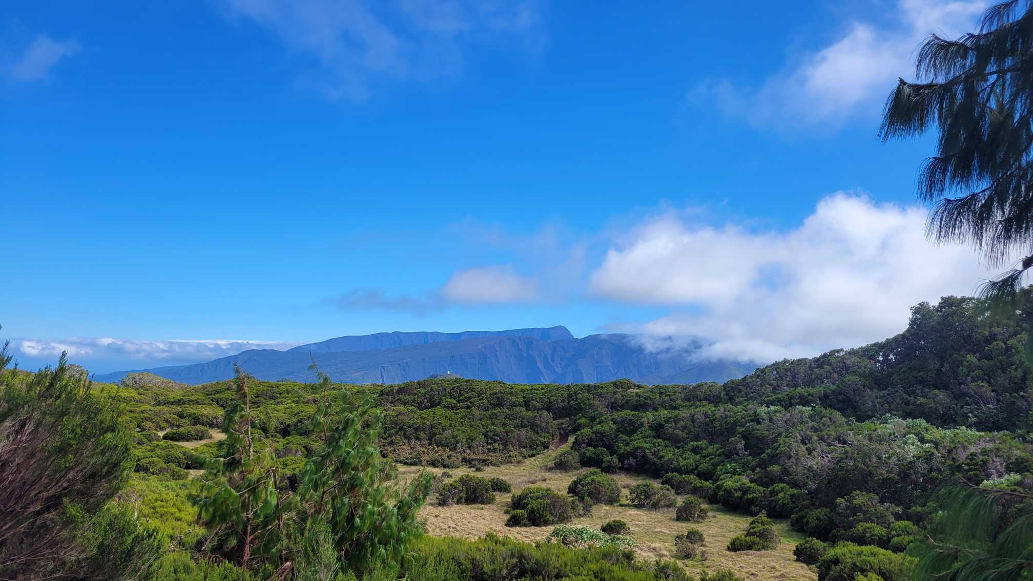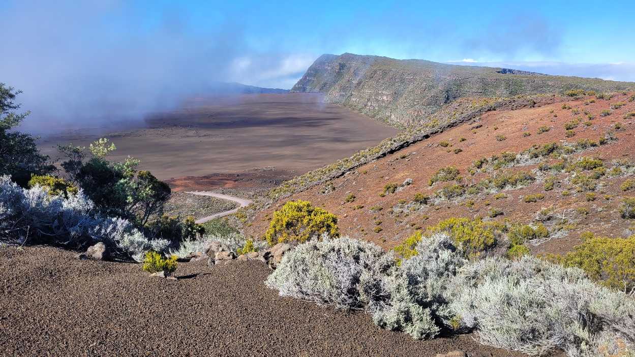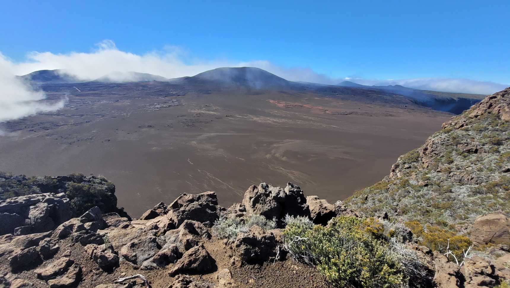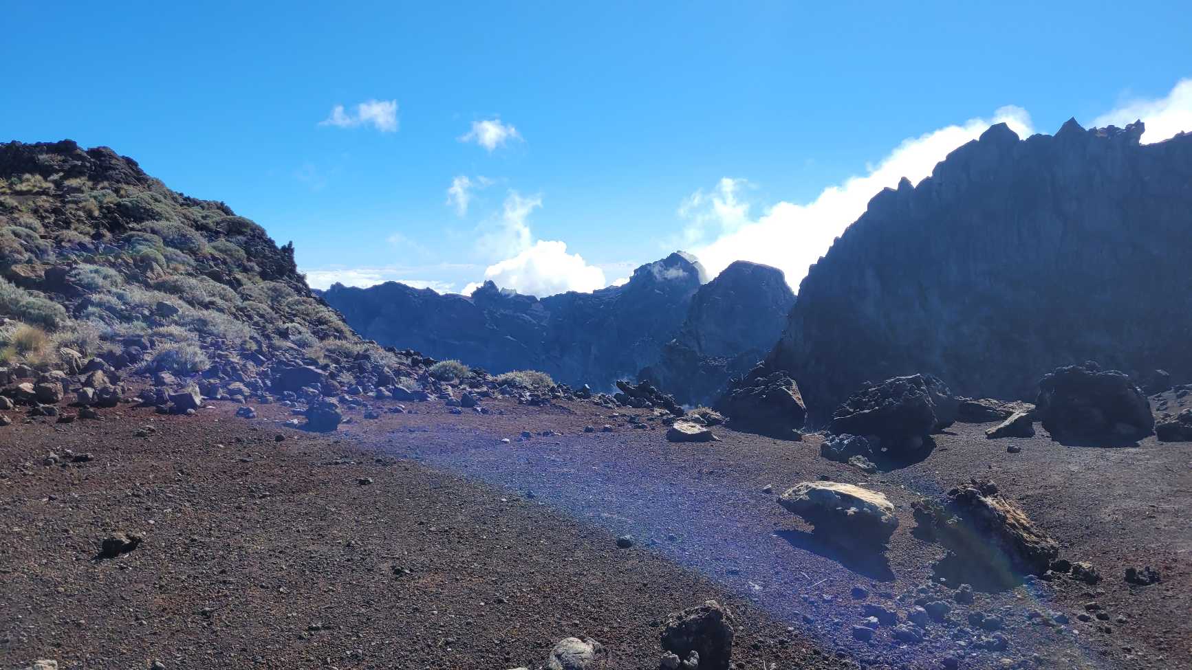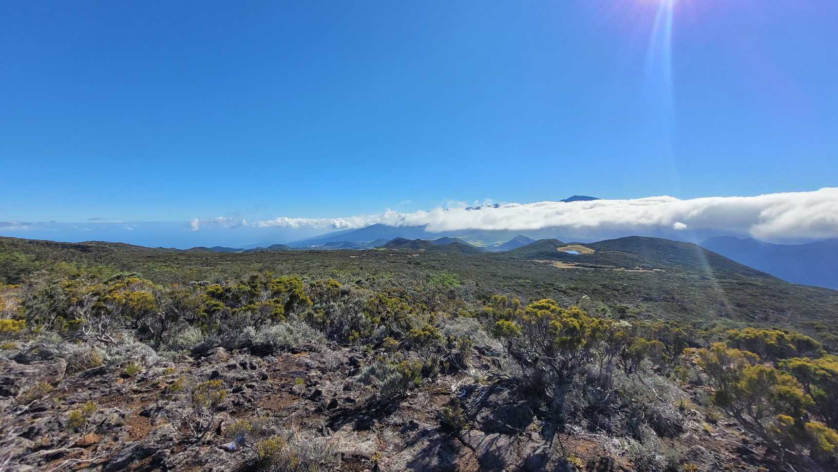 Zum Glück ist es aber trocken geblieben. Nach dem Frühstück liefen wir warm angezogen los und erreichten eine Höhe von 2500 m. Leider hatten wir keinen absolut freien Blick auf den Piton de la Fournaise, weil die Wolken ihn meist verdeckten.