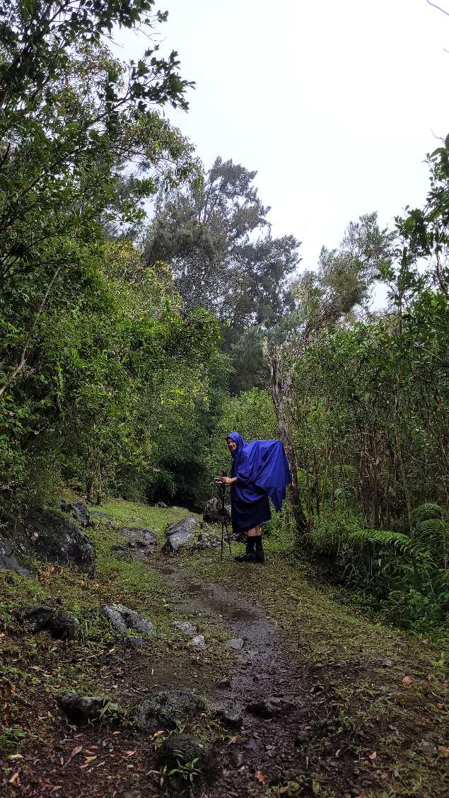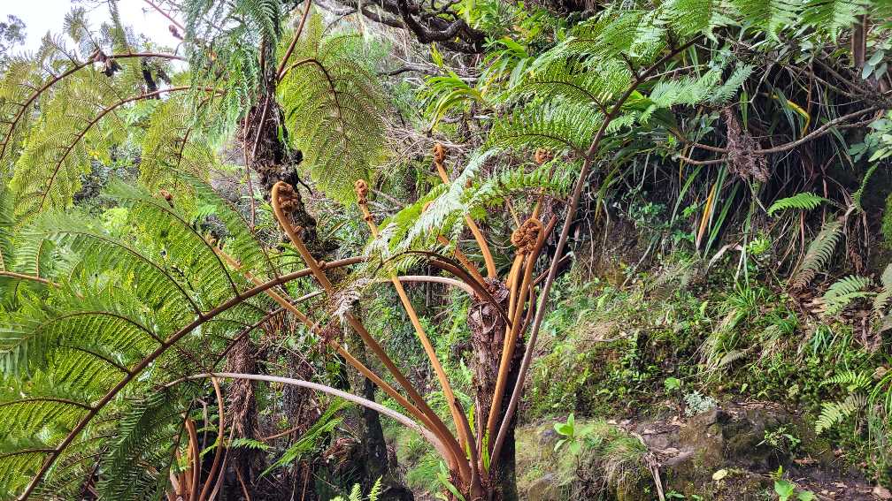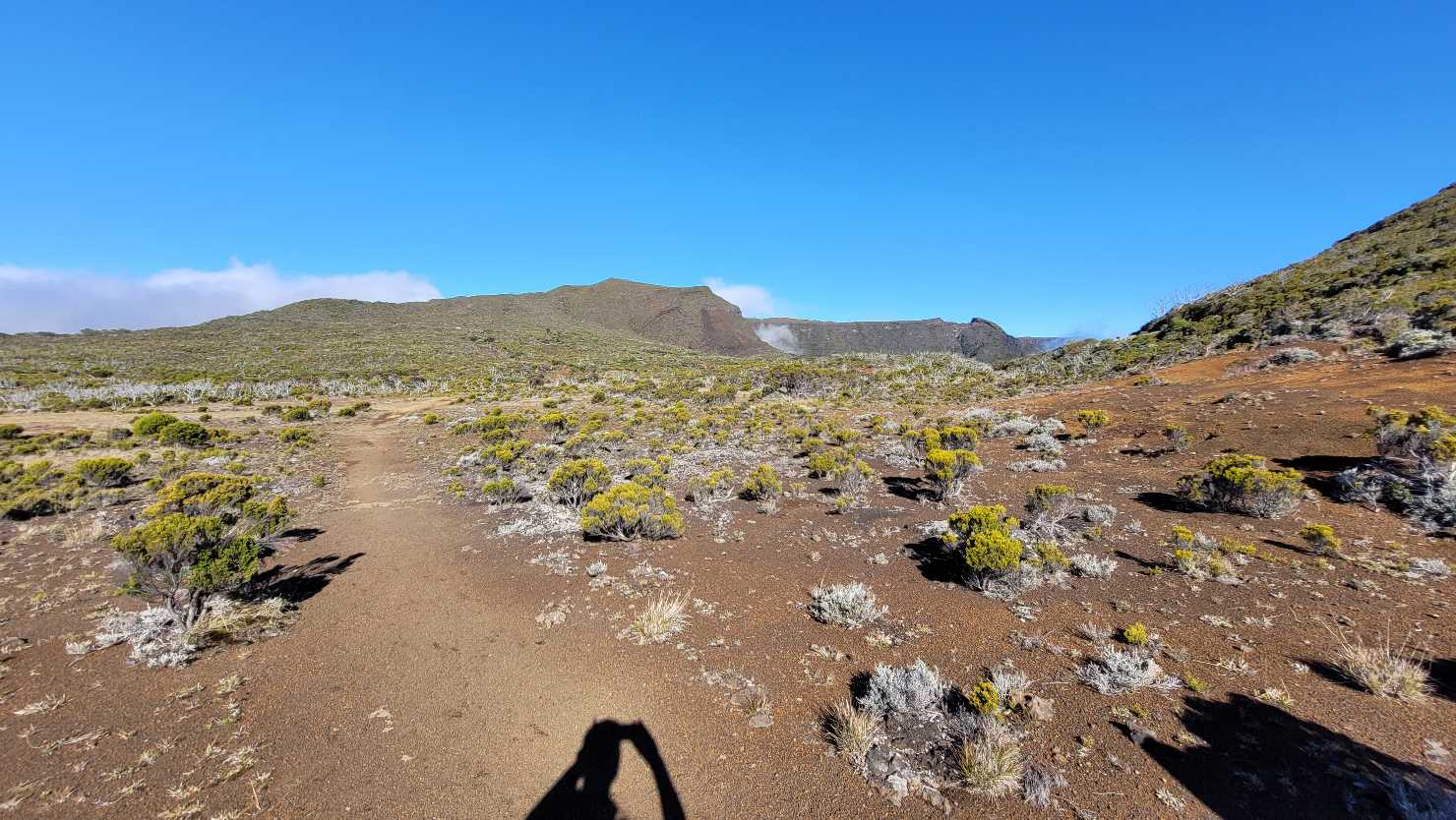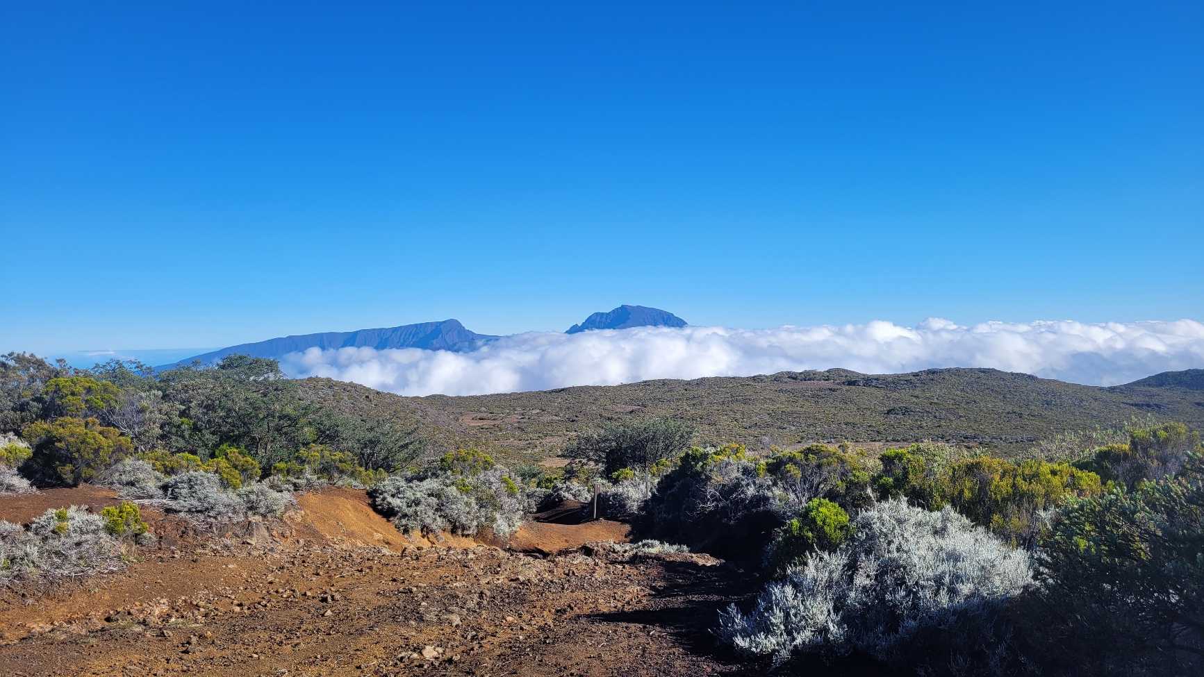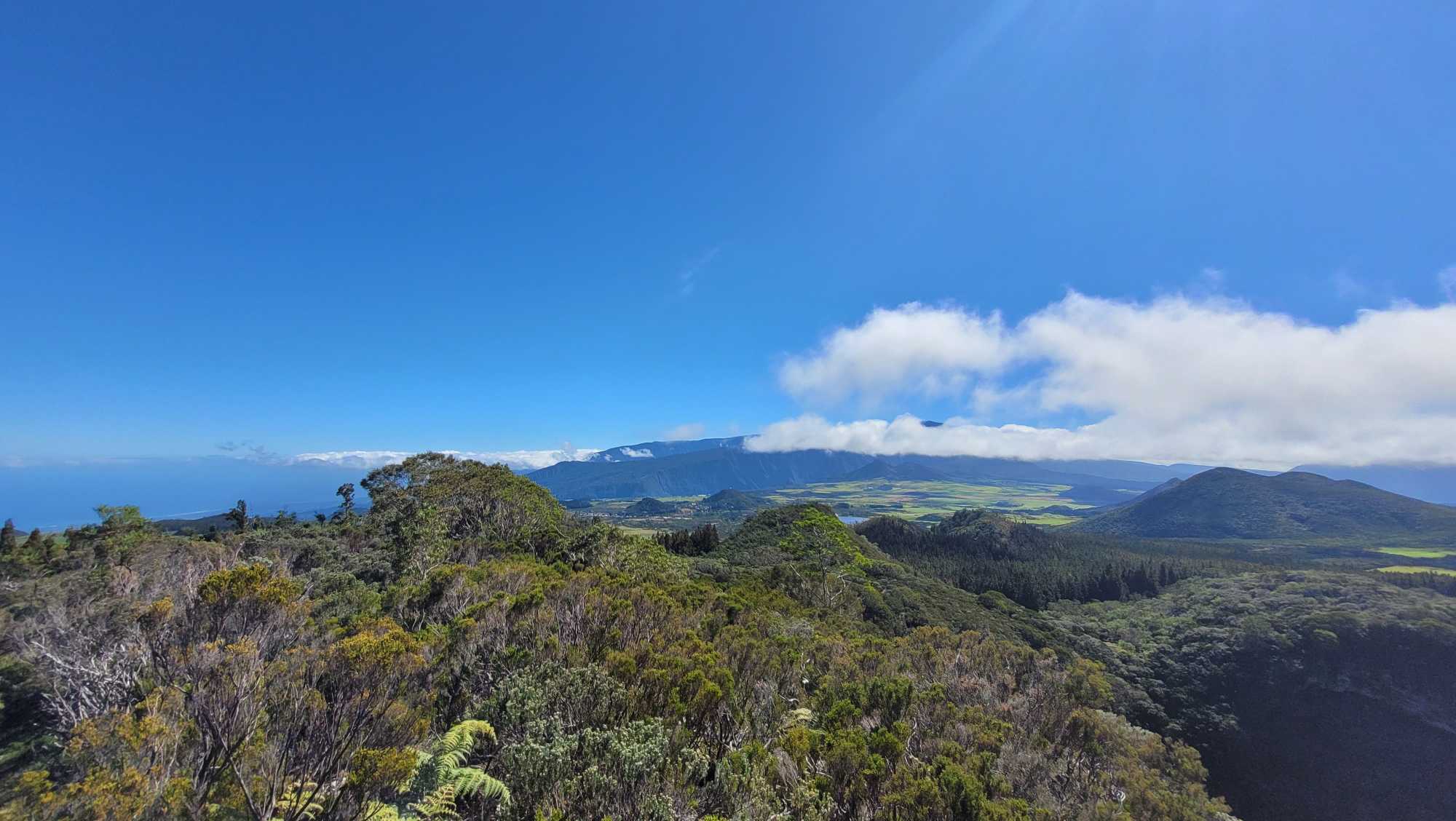 Zum Glück ist es aber trocken geblieben. Nach dem Frühstück liefen wir warm angezogen los und erreichten eine Höhe von 2500 m. Leider hatten wir keinen absolut freien Blick auf den Piton de la Fournaise, weil die Wolken ihn meist verdeckten.