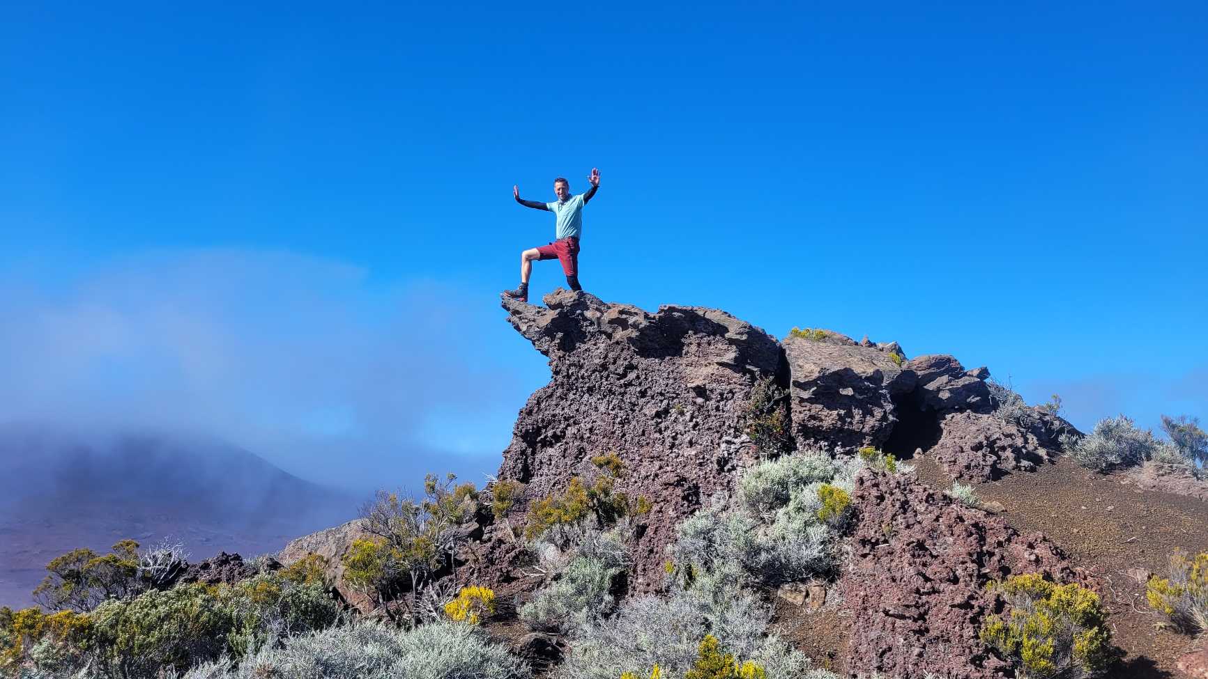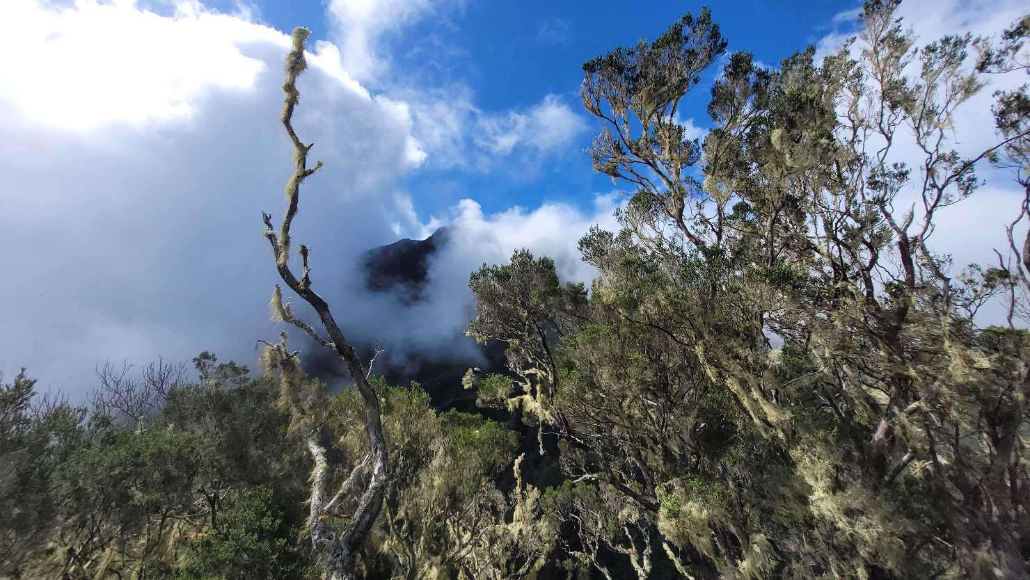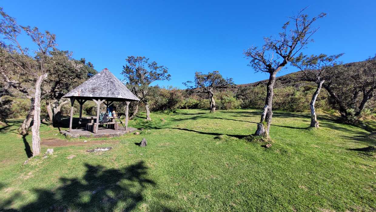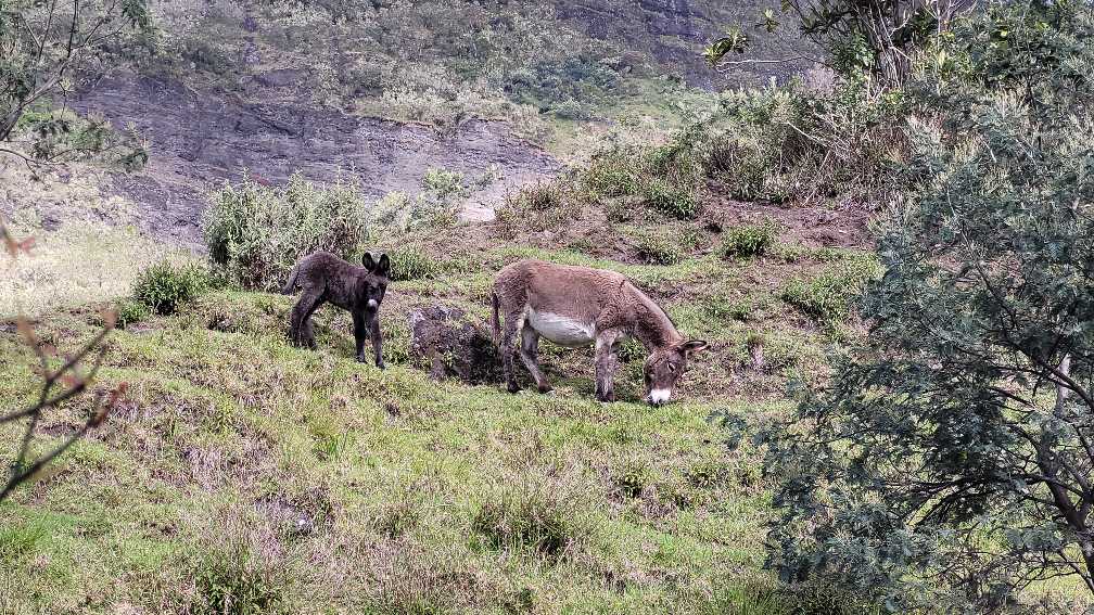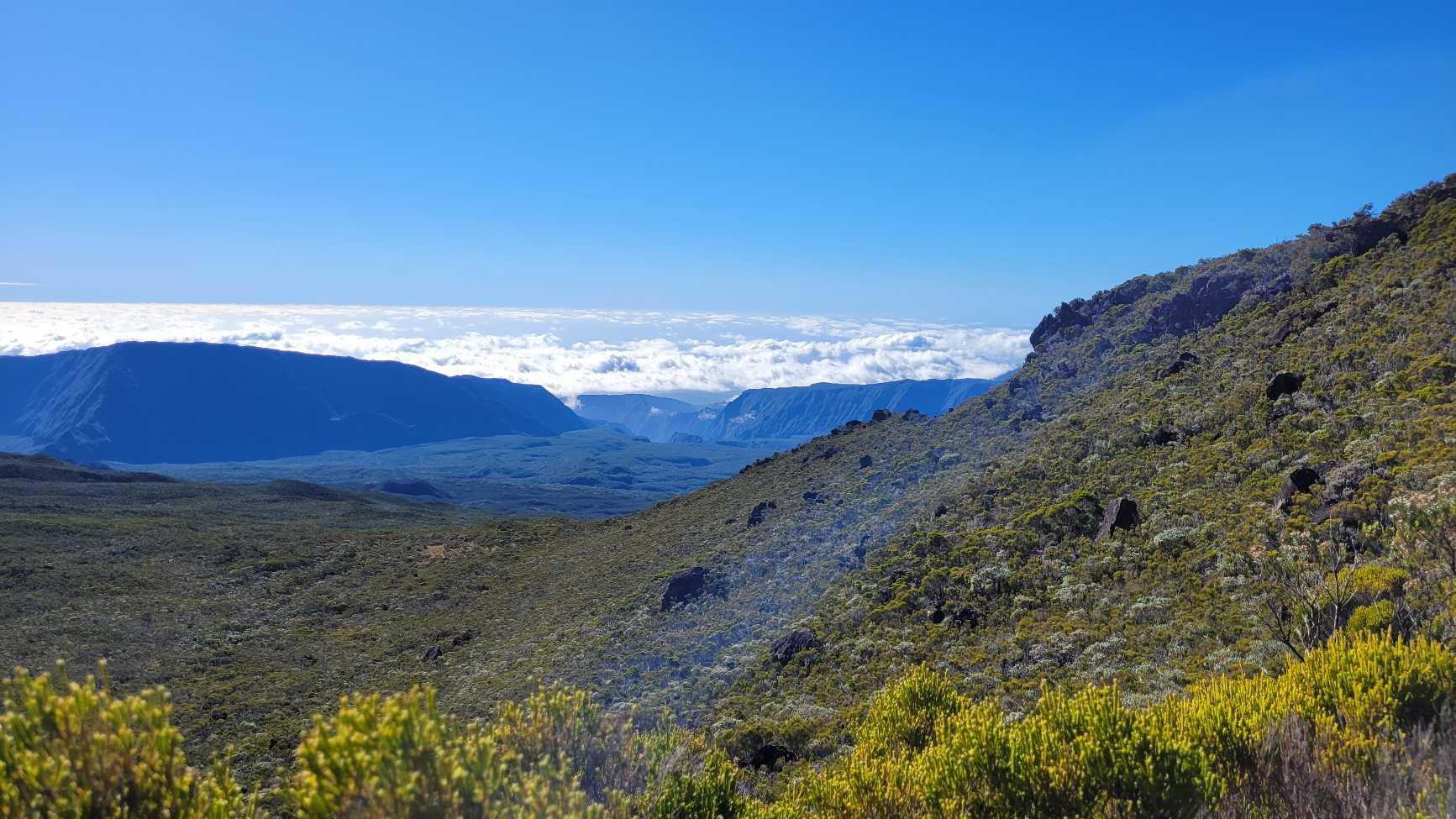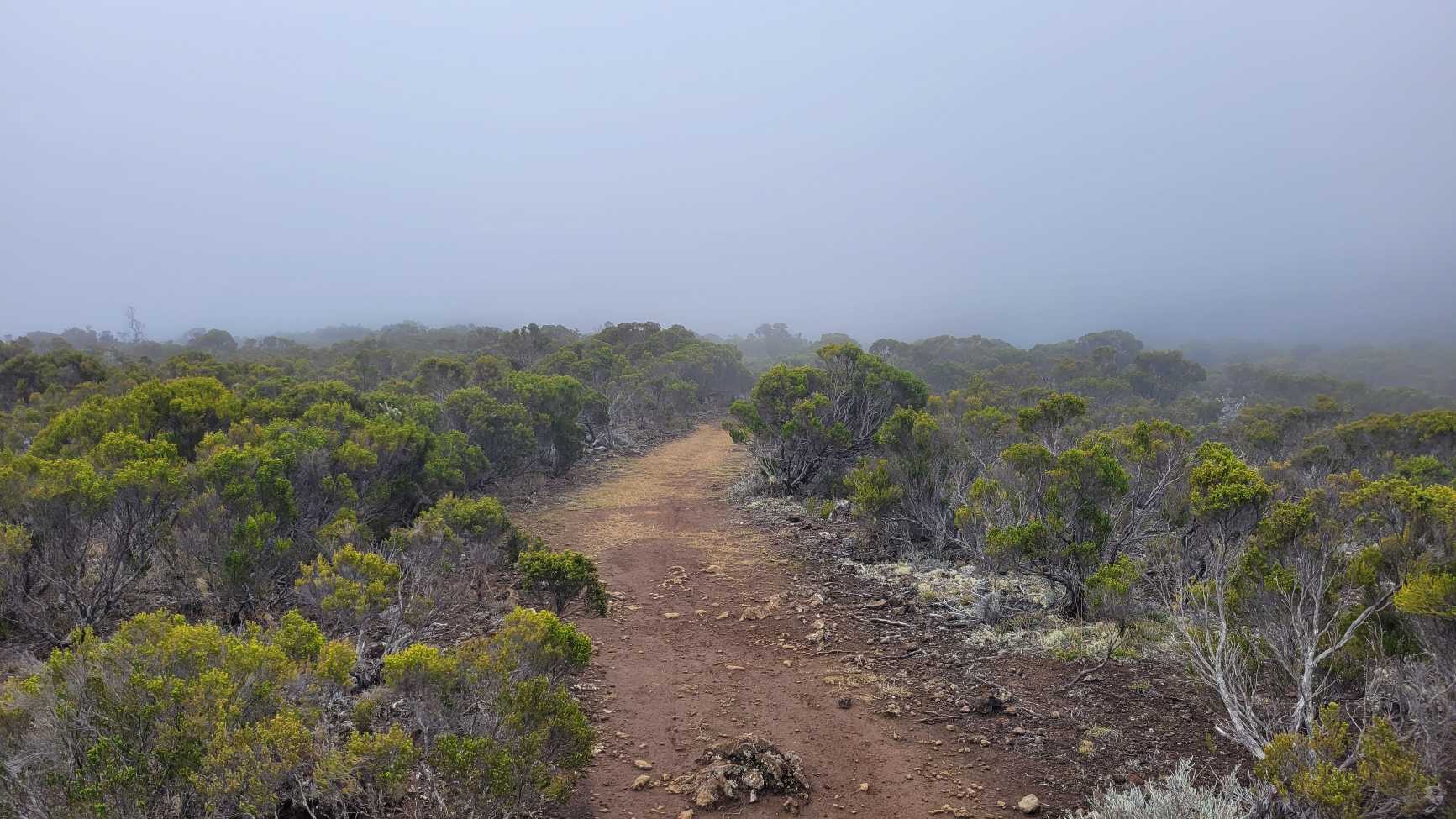 Zum Glück ist es aber trocken geblieben. Nach dem Frühstück liefen wir warm angezogen los und erreichten eine Höhe von 2500 m. Leider hatten wir keinen absolut freien Blick auf den Piton de la Fournaise, weil die Wolken ihn meist verdeckten.