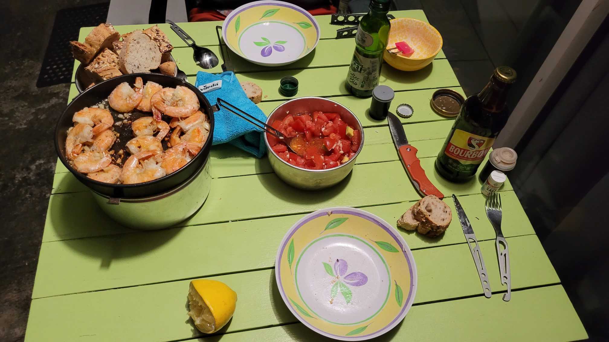 Nachdem wir unser Zelt aufgebaut hatten gab es Abendessen im Sonnenuntergang und ein Schoppen Wein.